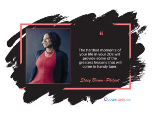 “The hardest moments of your life in your 20s will provide some of the greatest lessons that will come in handy later.”― Stacy Brown-Philpot“I like to swim a few times a week. It’s relaxing, and no one can call, email, or text me while I’m in the pool.”― Stacy Brown-Philpot“A lot of entrepreneurship … [Read more...] about Top 50 Stacy Brown-Philpot Quotes